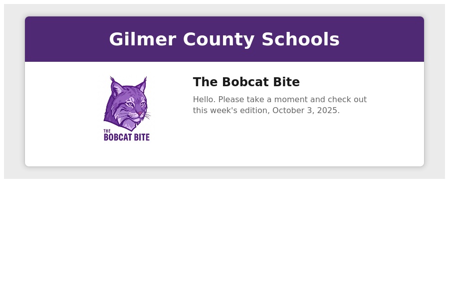 Gilmer County Schools The Bobcat Bite Hello. Please take a moment and check out this week's edition, October 3, 2025.